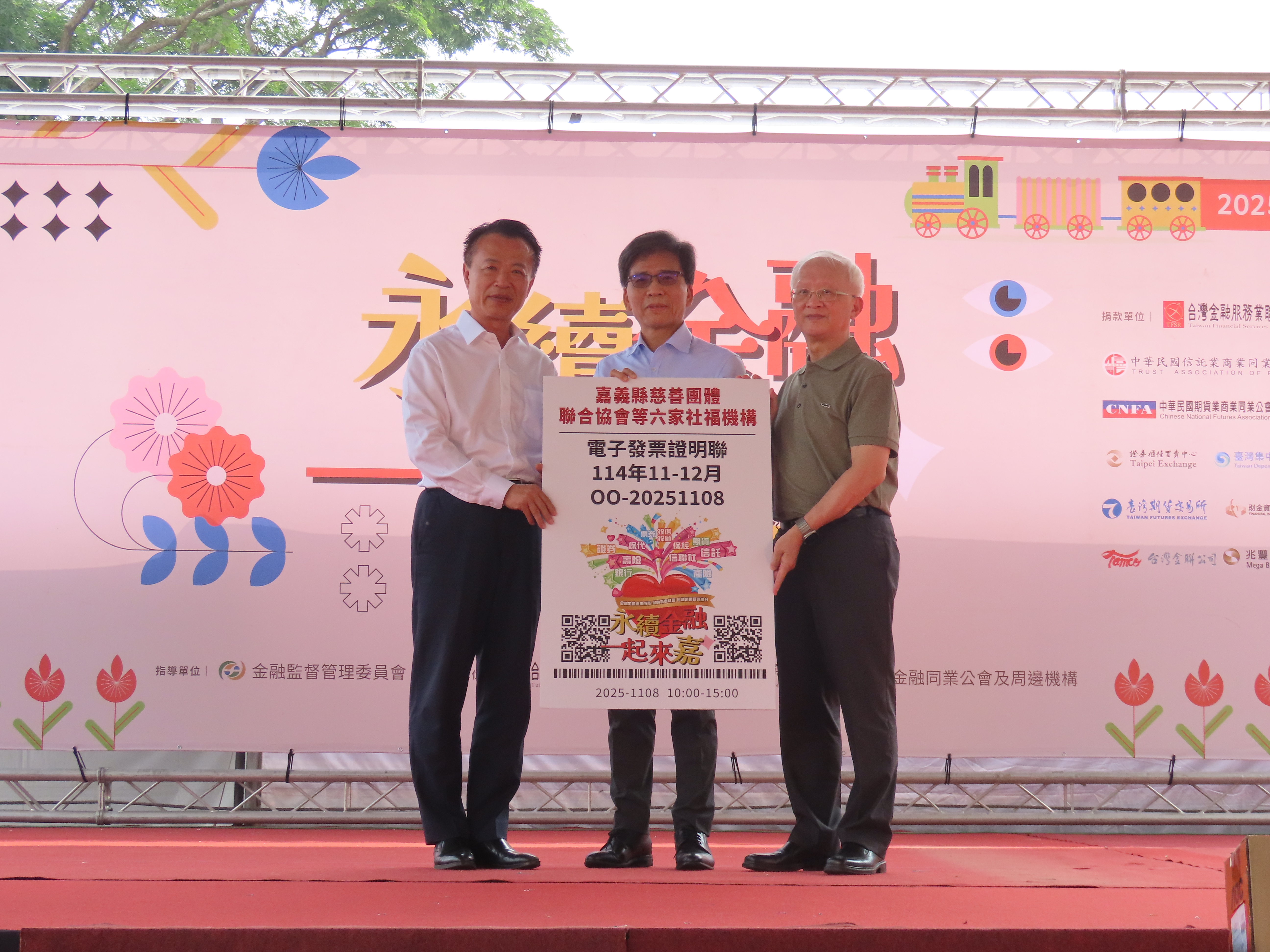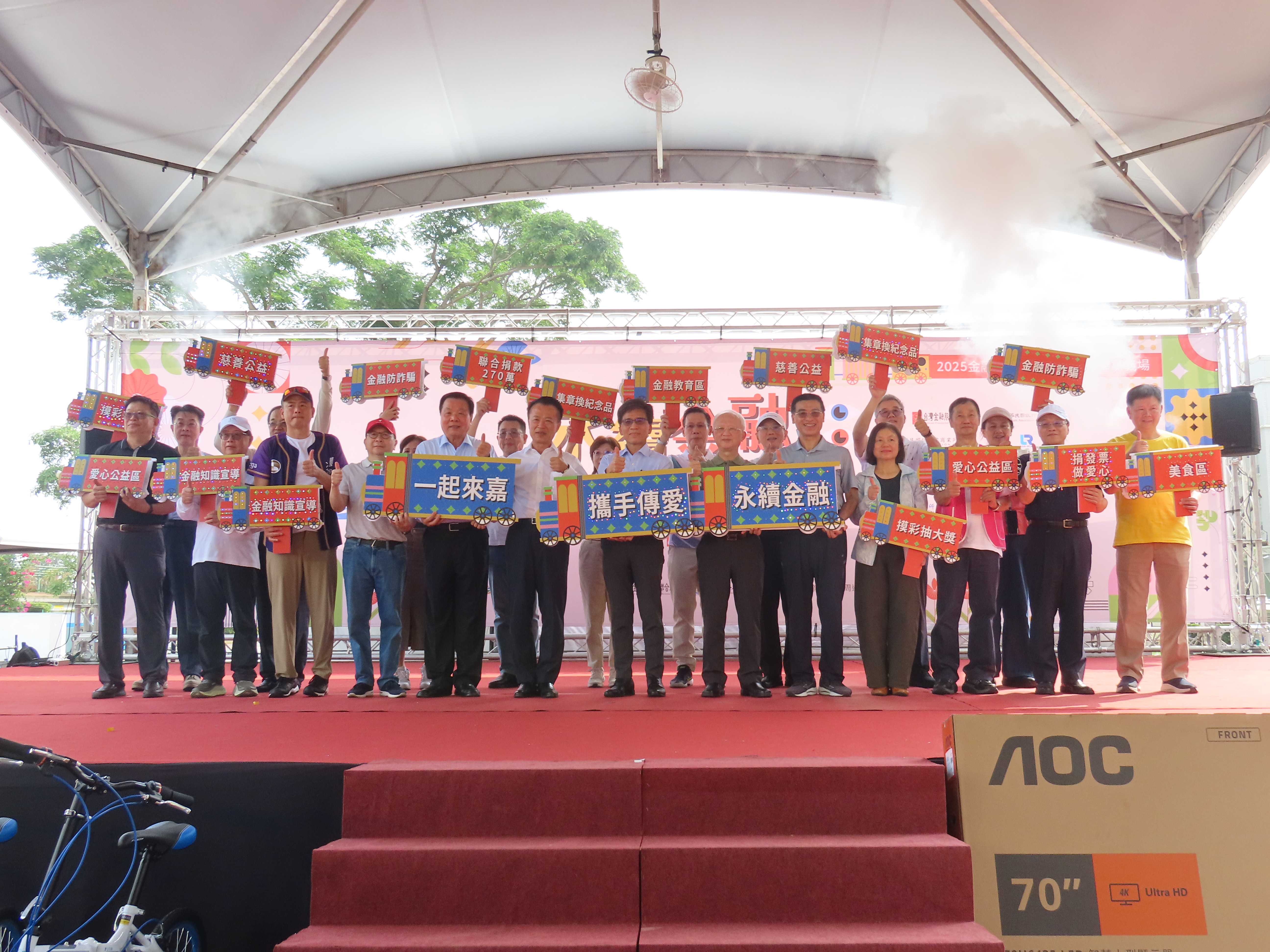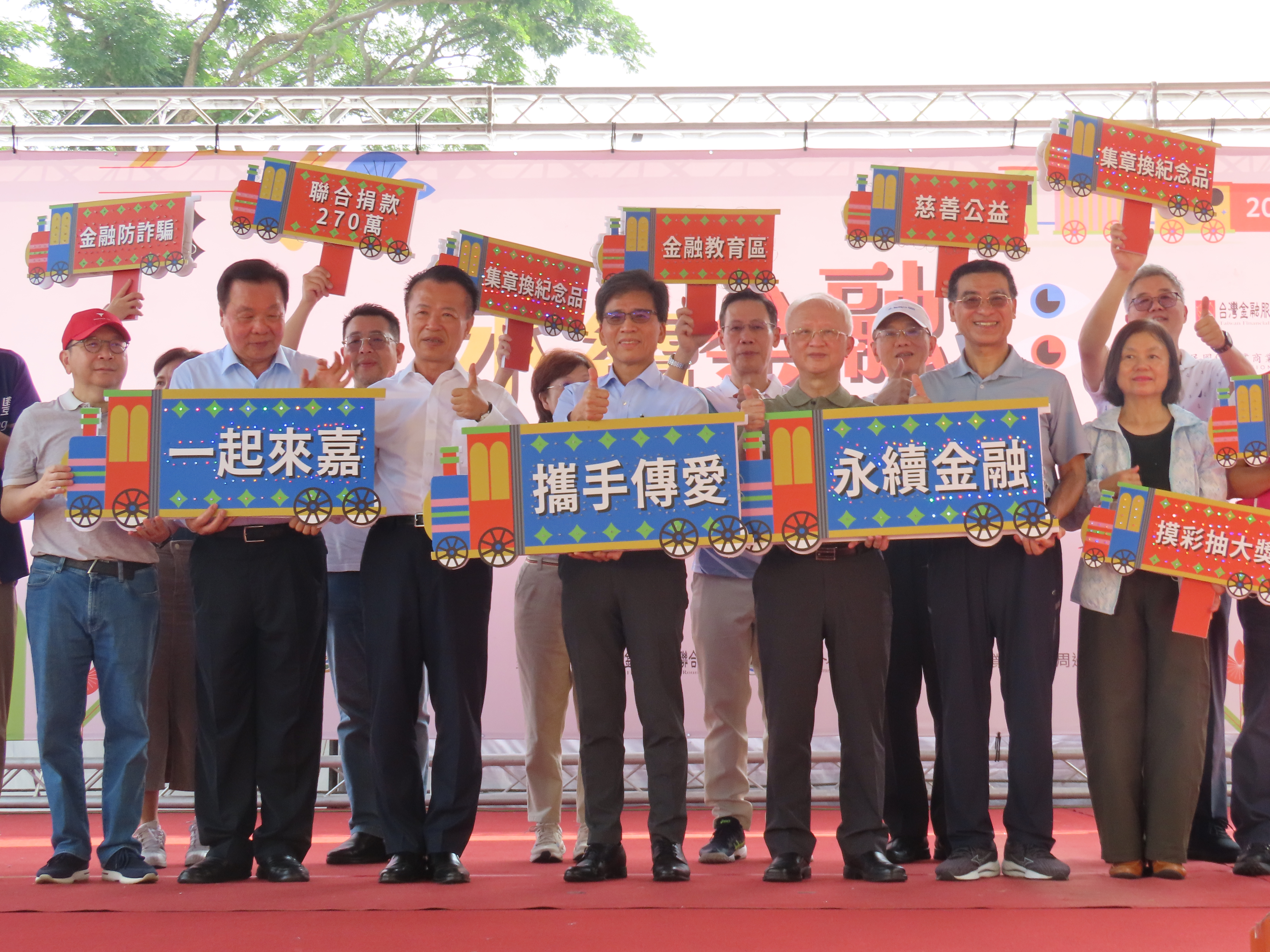 舞台活動同樣熱鬧,邀請在地表演團體與東森YOYO雲朵姐姐帶動唱跳,吸引親子參與,並安排金融知識有獎徵答及摸彩,送出70吋液晶電視、掃地機器人、摺疊車、電烤箱等百項獎品,炒熱氣氛。公益方面,本會攜手23個金融業公會、周邊單位及金融機構等,捐贈新台幣270萬元予嘉義縣政府社會局仁愛基金專戶,並將募集發票全數轉交社福團體,化愛心為資源,扶助弱勢族群。