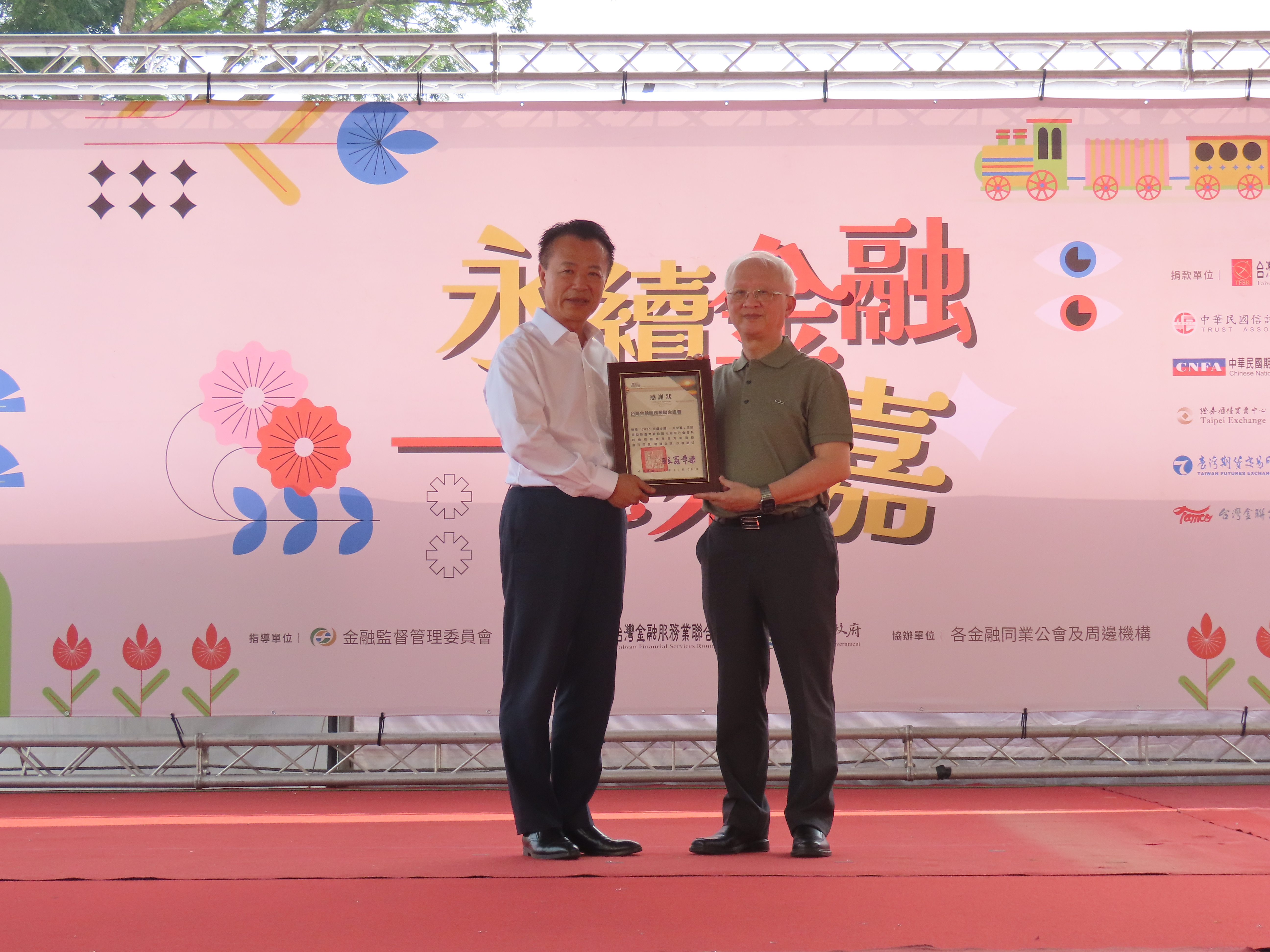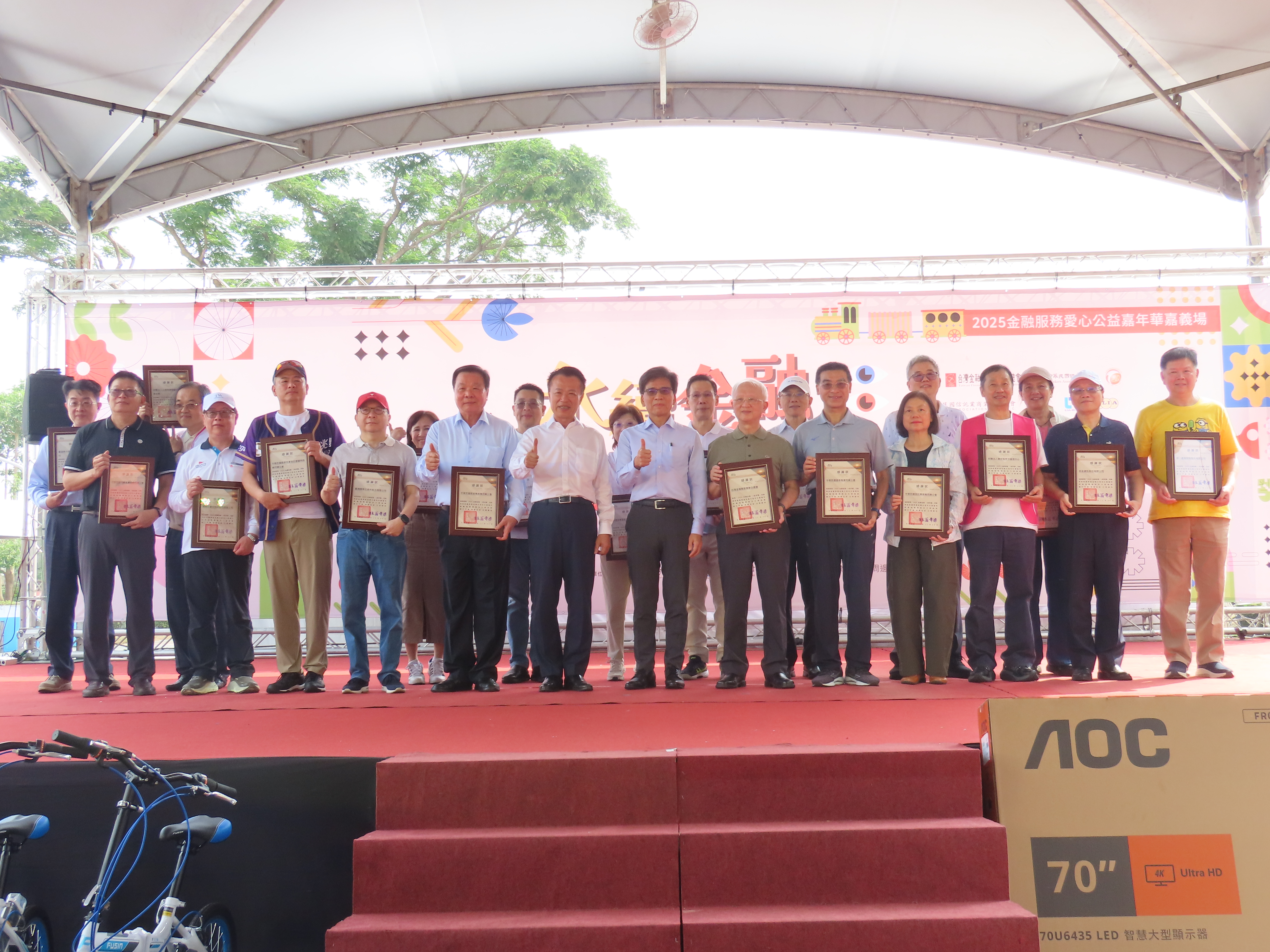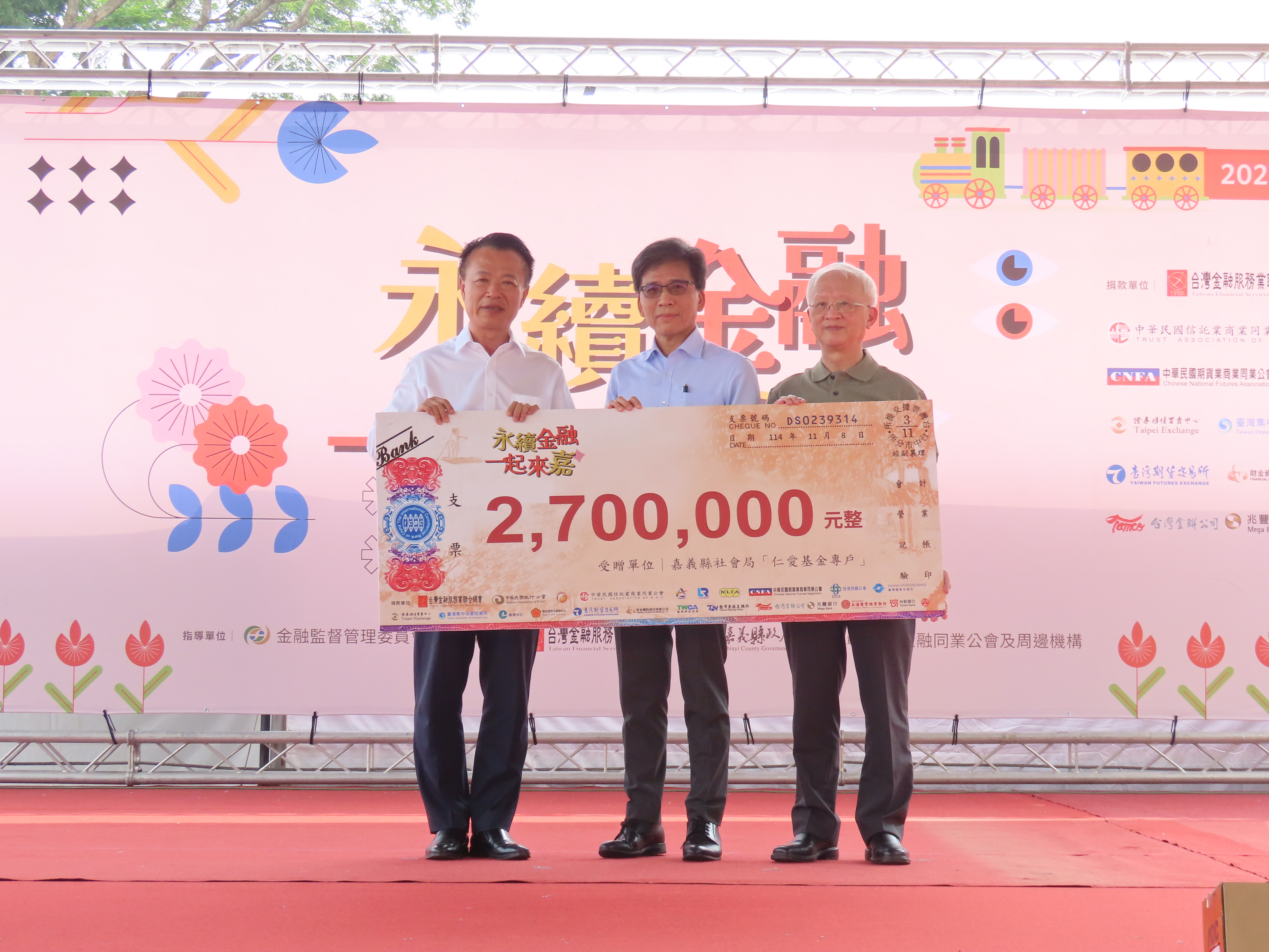 舞台活動同樣熱鬧,邀請在地表演團體與東森YOYO雲朵姐姐帶動唱跳,吸引親子參與,並安排金融知識有獎徵答及摸彩,送出70吋液晶電視、掃地機器人、摺疊車、電烤箱等百項獎品,炒熱氣氛。公益方面,本會攜手23個金融業公會、周邊單位及金融機構等,捐贈新台幣270萬元予嘉義縣政府社會局仁愛基金專戶,並將募集發票全數轉交社福團體,化愛心為資源,扶助弱勢族群。